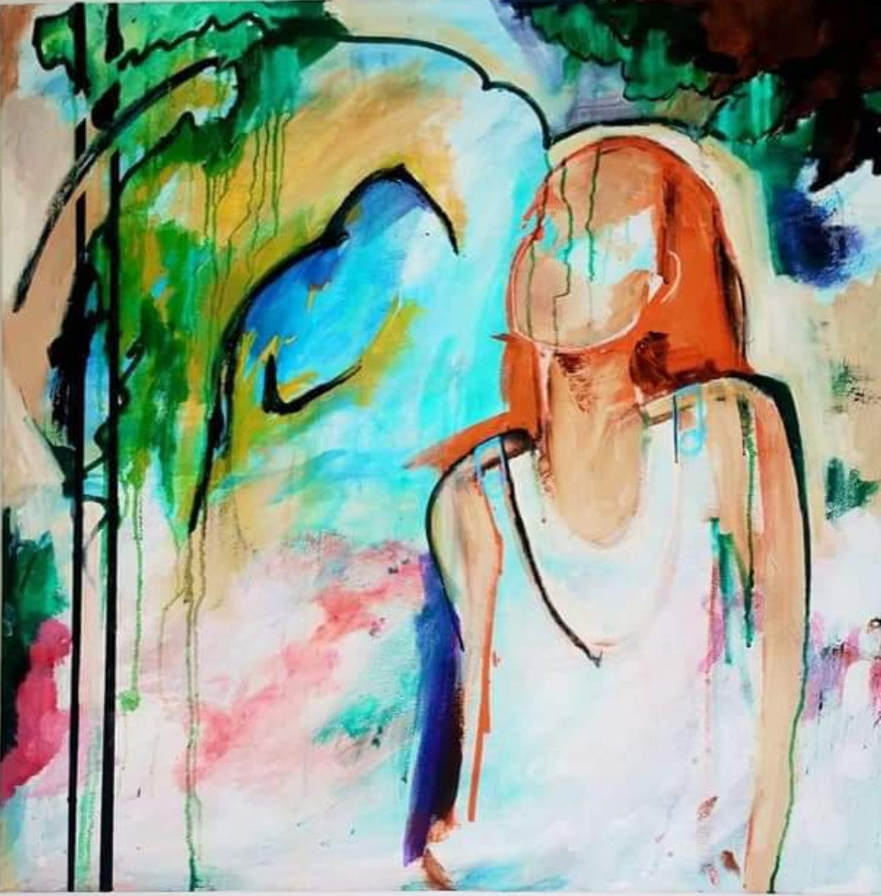 This striking abstract composition features Ann Marie, an Irish maiden with distinctive red hair, rendered through expressive brushwork and dynamic forms. A bird-like presence emerges within the layered composition, adding symbolic depth and movement to the piece. The work captures both figurative essence and abstract interpretation, inviting viewers to discover multiple narratives within its carefully orchestrated visual elements.